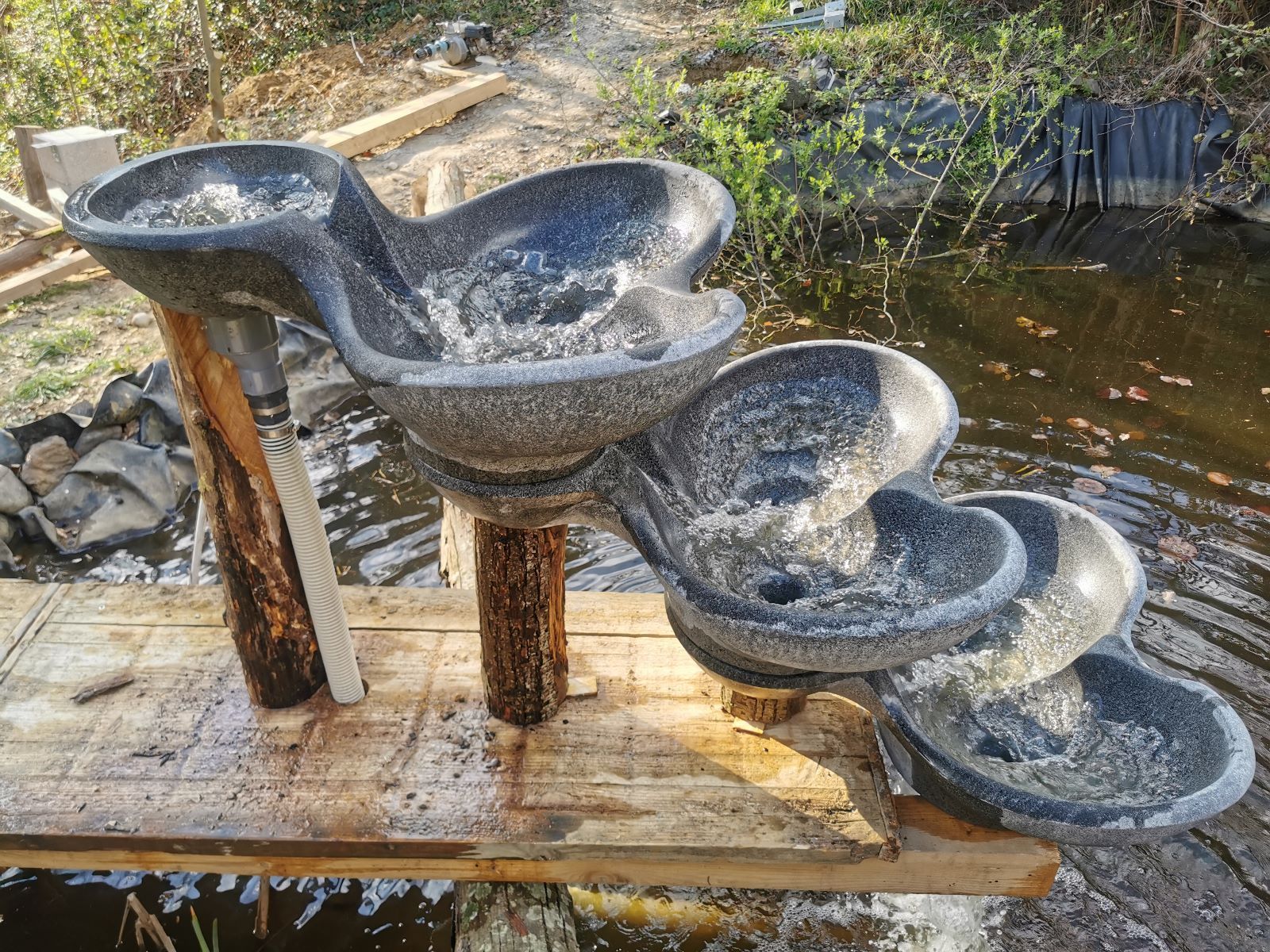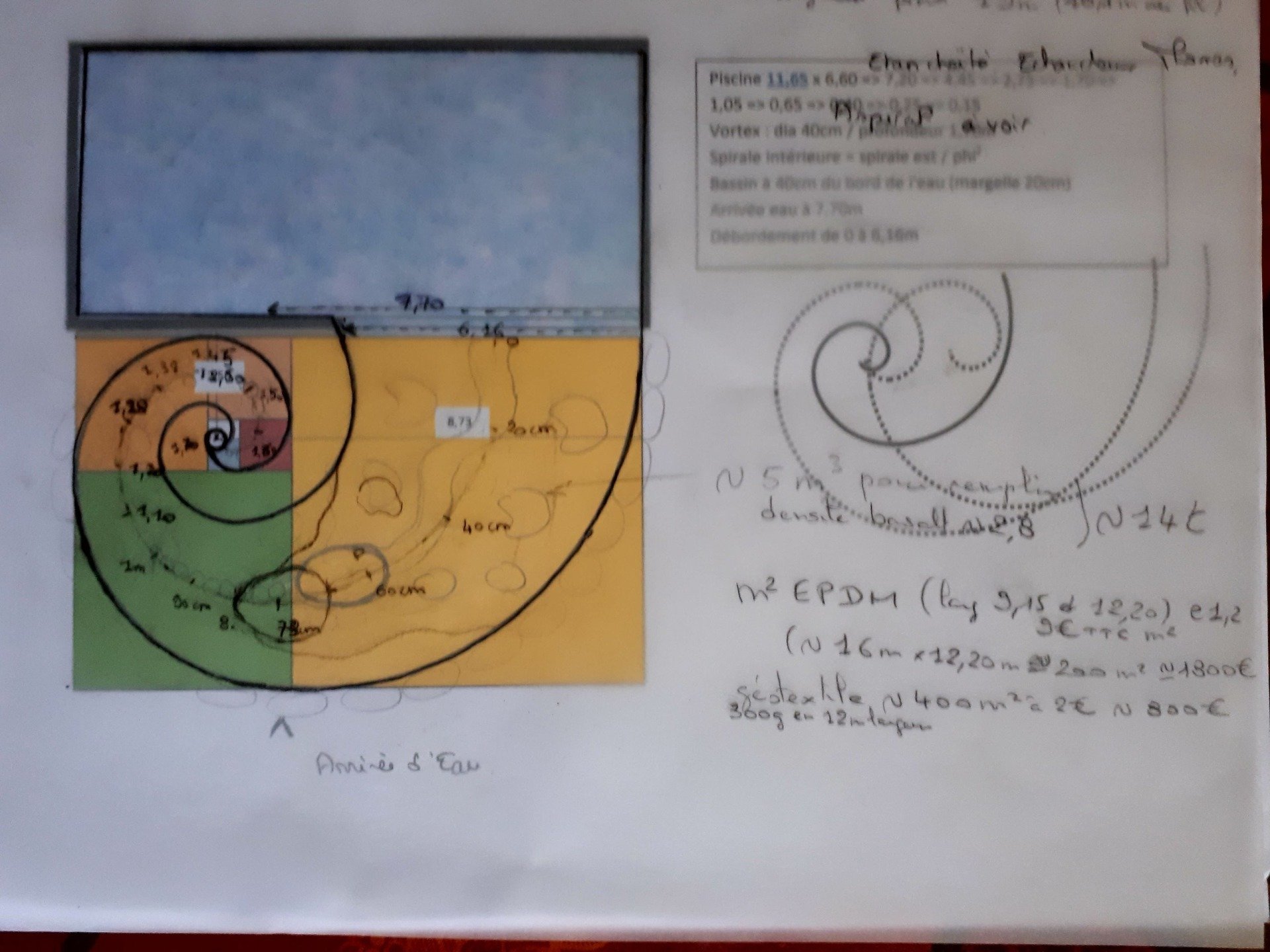 Le projet a été préparé tout au long de l'année 2018 avant d'être mis en œuvre en juin 2018 par une équipe de 4 personnes (équipe technique) et construit via un chantier participatif de 30 personnes. Il s'agit d'allier les 3 principes exprimées dans le livre pour avoir de l'eau cristalline sans produit chimique et sans nécessairement avoir une surface de plantes filtrantes énorme : à savoir 1) la mise en place d'un vortex, 2) l'emploi de matériaux spécifiques et 3) une forme spécifique. La photo 2 après le plan le montre 3 ans après sa réalisation.